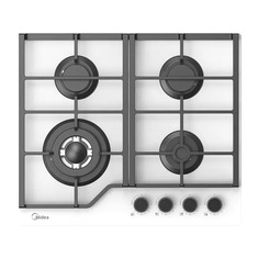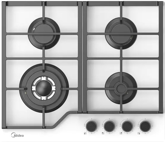 Газовая варочная панель Midea MG697TGW — стильная и современная. Соединяет в себе изысканность белого стекла и строгость линий чугунных решеток конфорок.