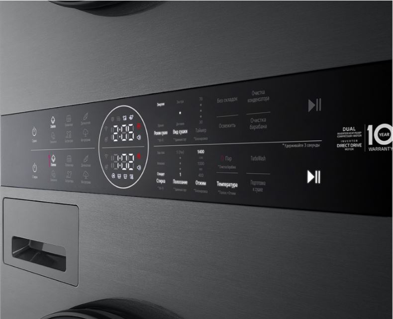 WashTower — это единый блок, в котором каждая секция работает как самостоятельное устройство, но при этом взаимодействует друг с другом. Благодаря технологии Smart Pairing сушильный цикл автоматически подстраивается под выбранную программу стирки. Технология AI DD в нижнем отсеке анализирует тип ткани и подбирает алгоритм стирки. Режим TurboWash 360 позволяет постирать вещи за 39 минут. Для чувствительной кожи предусмотрена программа Allergy Care с паром, которая помогает уменьшить количество аллергенов. DUAL Inverter HeatPump в сушильной части обеспечивает быструю и щадящую сушку при низких температурах. Автоматическая очистка конденсатора избавляет от необходимости регулярного обслуживания вручную. Модель оснащена LED-дисплеем с сенсорным управлением, расположенным по центру — на удобной высоте, между отсеками.