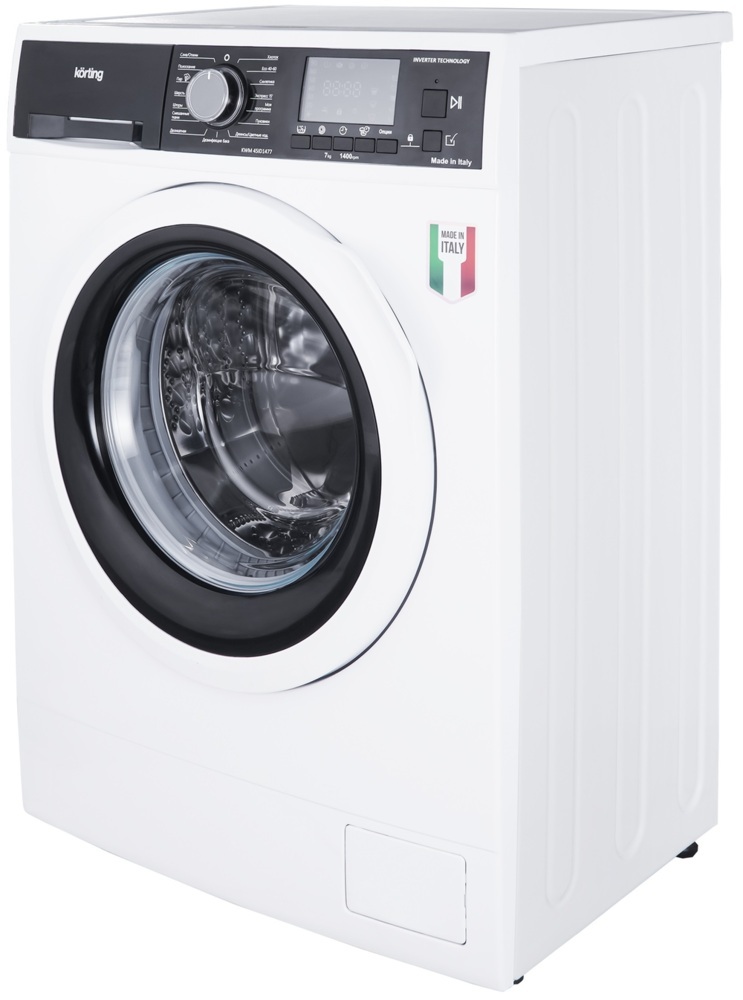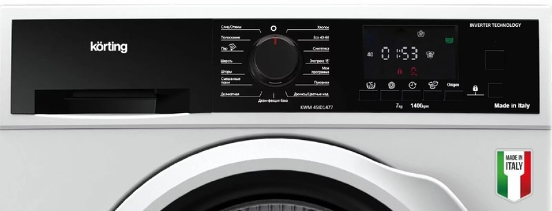 При необходимости пользователь запускает отложенный старт в диапазоне от 1 ч до суток. Этапы работы устройства сопровождаются звуковыми сигналами, которые отключаются нажатием одной кнопки. Блок управления удобно расположен на фронтальной панели стиральной машины Korting KWM 45ID1477. Пользователь активирует подходящий режим, скорость отжима, дополнительные функции посредством программатора и клавиш с текстовыми и символьными подсказками. Заданные опции и время до окончания цикла отображаются на цифровом дисплее. Чтобы ребенок случайно не изменил параметры, есть блокировка контрольной панели.