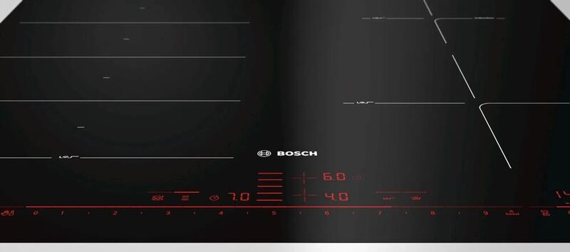 Bosch PXE601DC1E — варочная панель, работающая по индукционной технологии. На ней обозначено пять зон нагрева, причем две из них можно объединить в одну — на тот случай, если вам нужно использовать большую посуду.