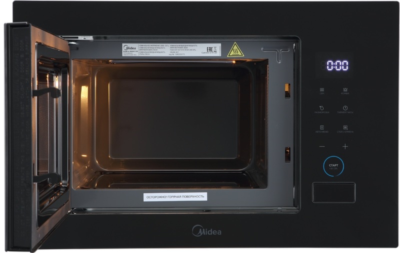 Встраиваемая микроволновая печь с грилем Midea MI982617GB серии Modern выполнена с фасадом из черного стекла, что позволяет ей вписать в большинство кухонных интерьеров. Сенсорное управление позволяет выбрать необходимые параметры приготовления. Дверца открывается с помощью механической кнопки. Цифровой дисплей поможет настроить текущее время и кухонный таймер. Рабочая камера из эмалированной стали имеет внутренний объем 26 литров. Быстрый старт запускает приготовление на максимальной мощности нажатием одной кнопки. Мощность микроволн регулируется на 5 уровнях. Максимальная мощность - 900 Вт, гриля - 1000 Вт. Микроволновая печь оснащена режимами и функциями: Микроволны, Микроволны + Гриль, Гриль, Размораживание по времени/весу. Кроме того предусмотрено 10 автоматических программ: Автоподогрев, Мясо, Овощи, Макароны, Картофель, Рыба, Напитки, Попкорн, Тушеная курица, Суп.