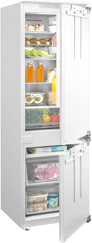 Встраиваемый холодильник Midea MDRE371FGE01M высотой 178.5 см имеет общий полезный объем 274 литра, из них холодильное отделение - 198 л., морозильное отделение - 76 л. Сенсорное управление с внешним дисплеем позволяет легко настроить нужную температуру и выбрать подходящий режим. Энергосберегающее LED-освещение холодильного отделения обеспечивает яркость и удобство при поиске продуктов. Система No Frost помогает предотвратить образование наледи на стенках или продуктах, тем самым исключая необходимость в размораживании с определенной периодичностью. Металлическая панель Metal Cooling быстрее восстанавливает температуру в камере при частом открывании двери, при этом является стильным элементом внутреннего дизайна. Инверторный компрессор более энергоэффективный, долговечный и тихий, гарантия на него составляет 10 лет. Функции «Суперохлаждение» и «Суперзаморозка» ускорят достижение оптимальной температуры и сохранят все вкусовые качества продуктов. Ящик с регулируемой влажностью позволяет хранить различные типы овощей и фруктов при влажности 60-80%. Перенавешиваемая дверь позволяет адаптировать прибор к планировке помещения.