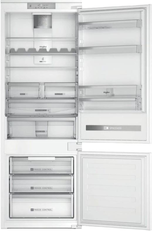 Встраиваемый холодильник Whirlpool SP40 812 EU2 с общим полезным объемом 400 л имеет две камеры. Верхнее отделение разделено на функциональные зоны посредством стеклянных полок, высоту которых пользователь может регулировать по собственному усмотрению. Это создает удобство при хранении домашней консервации или посуды нестандартного размера. Для яиц, бутылок, соусов на двери есть дополнительные полочки с высокими бортиками, что исключает падение продуктов при резком открытии холодильника.