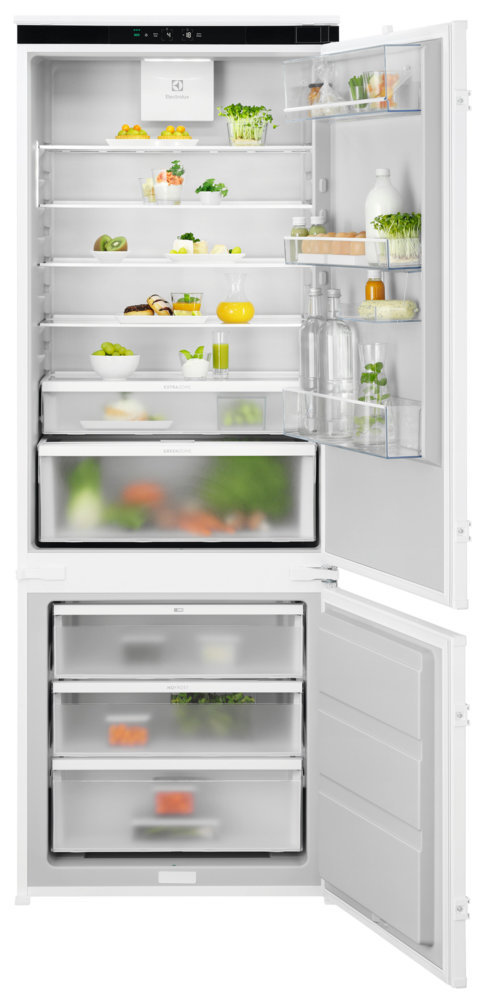 Двухкамерный Electrolux E7TNGE75S серии GreenZone 700 относится к устройствам с низким энергопотреблением (класс А++) и имеет двухкамерную конструкцию с двумя перевешиваемыми дверьми. Нижняя камера – морозильная. В ней находятся три ящика общим объемом 87 л. Мощность заморозки в данном отсеке –10.5 кг/сут. Внутренний полезный объем холодильной камеры состовляет 256 л. Особенностью модели является GreenZone - идеальный ящик для хранения, который устраняет лишнюю влагу, сохраняя при этом нужное количество, необходимое овощам. Это позволяет сохранить до 95% витаминов через 11 дней, защищая продукты соответствующим уровнем влажности.
